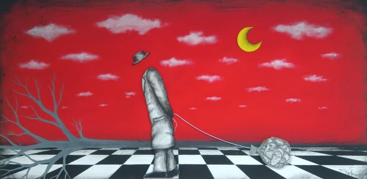 » Xilovatis Ioannis, 2025, the one thousand faces of mr Jones, 120x60 cm mixed media on wood 3D